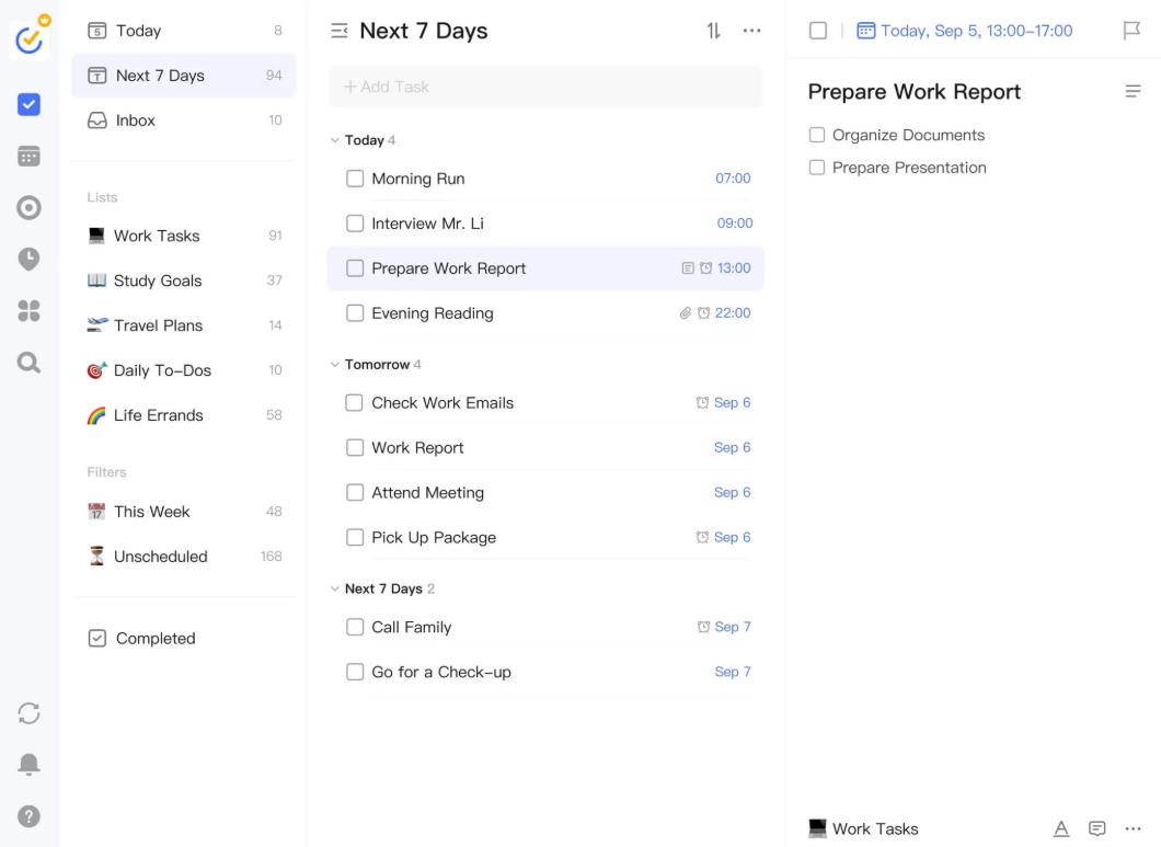TickTick은 개인을 위한 생산성 도구로 설계된 할 일 관리 애플리케이션이다. 사용자는 손쉽게 할 일을 생성하고, 마감일을 설정하며 알림을 받을 수 있다. 각 작업에는 메모나 파일 첨부도 가능하고, 반복 작업 설정 또한 지원한다.